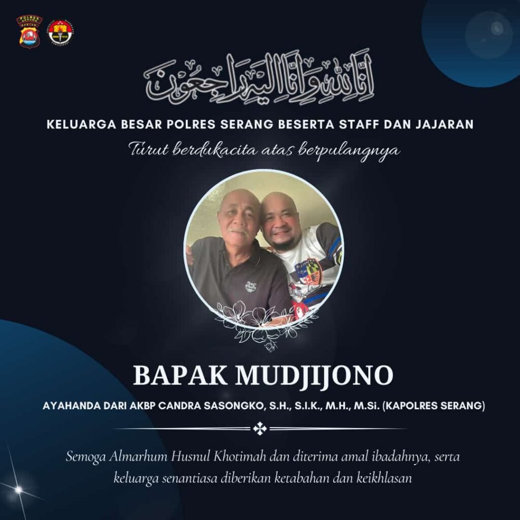 Serang, Catatanfaktanews – Kabar duka menyelimuti jajaran Polres Serang. Mudjiono, ayahanda dari Kapolres Serang, AKBP Candra Sasongko, S.H., S.I.K., M.H., M.Si., berpulang ke rahmatullah.